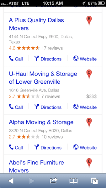 It looks like Google has been testing large orange stars for the business ratings in the SERPs. I found that it is pretty consistent across browsers. I first noticed the change when using Google Chrome and searching the query “movers dallas.”